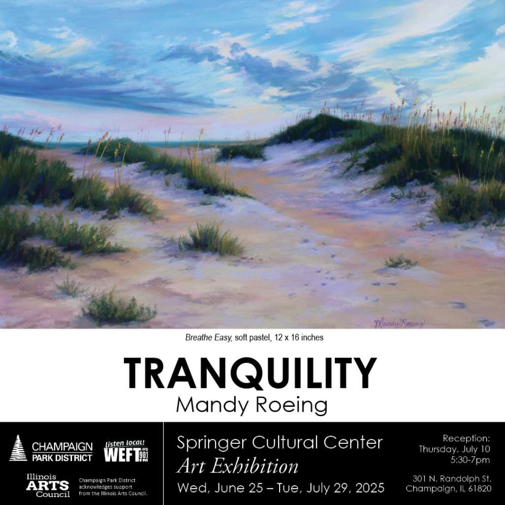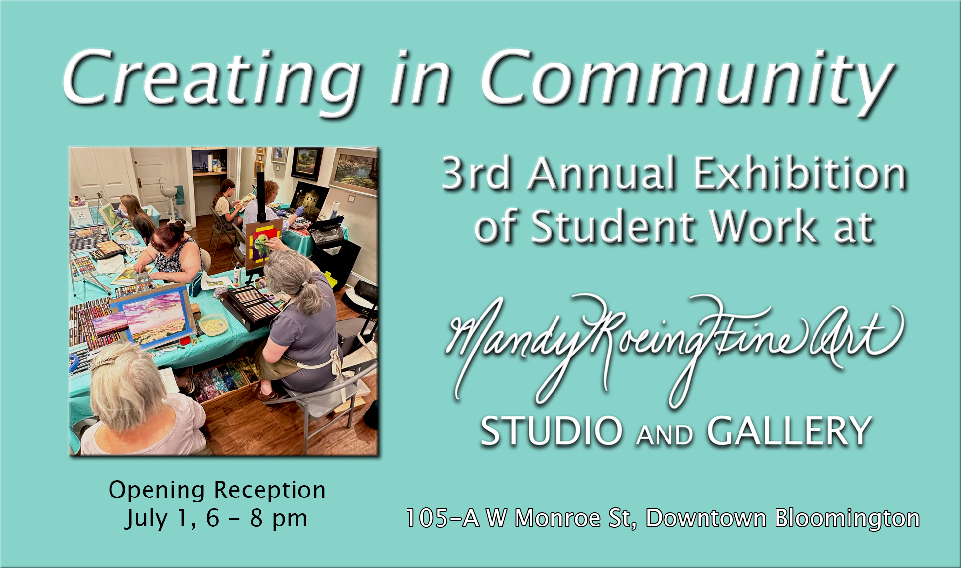 My studio gallery is located in downtown Bloomington, IL at 105-A W. Monroe St, and parking is available on the surrounding streets and nearby public parking lots and structures.